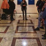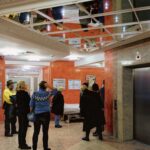 Die Vernissage beginnt im Erdgeschoss, im Foyer der Röntgenabteilung der Klinik. Eine außergewöhnliche Lokalität, praktisch steht hier Kunst, oder besser hängt, unmittelbar neben den notwendigen Einrichtungsgegenständen eines Krankenhaues. Ein besonderes Spannungsverhältnis in Betrachtung von nicht alltäglichen Werken.