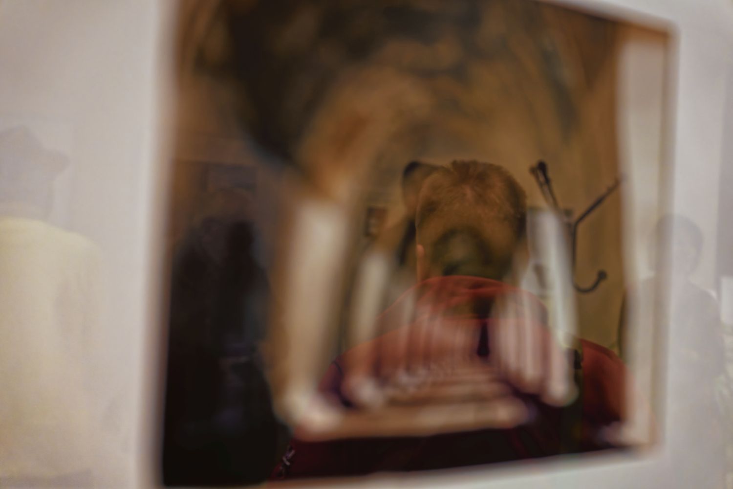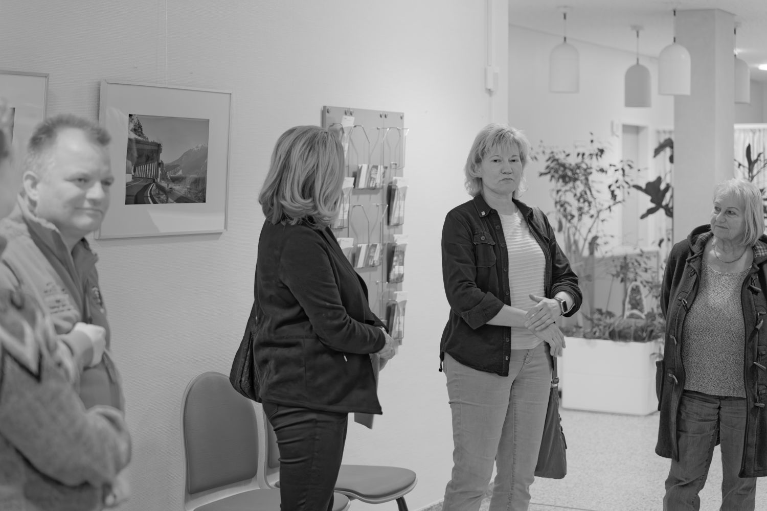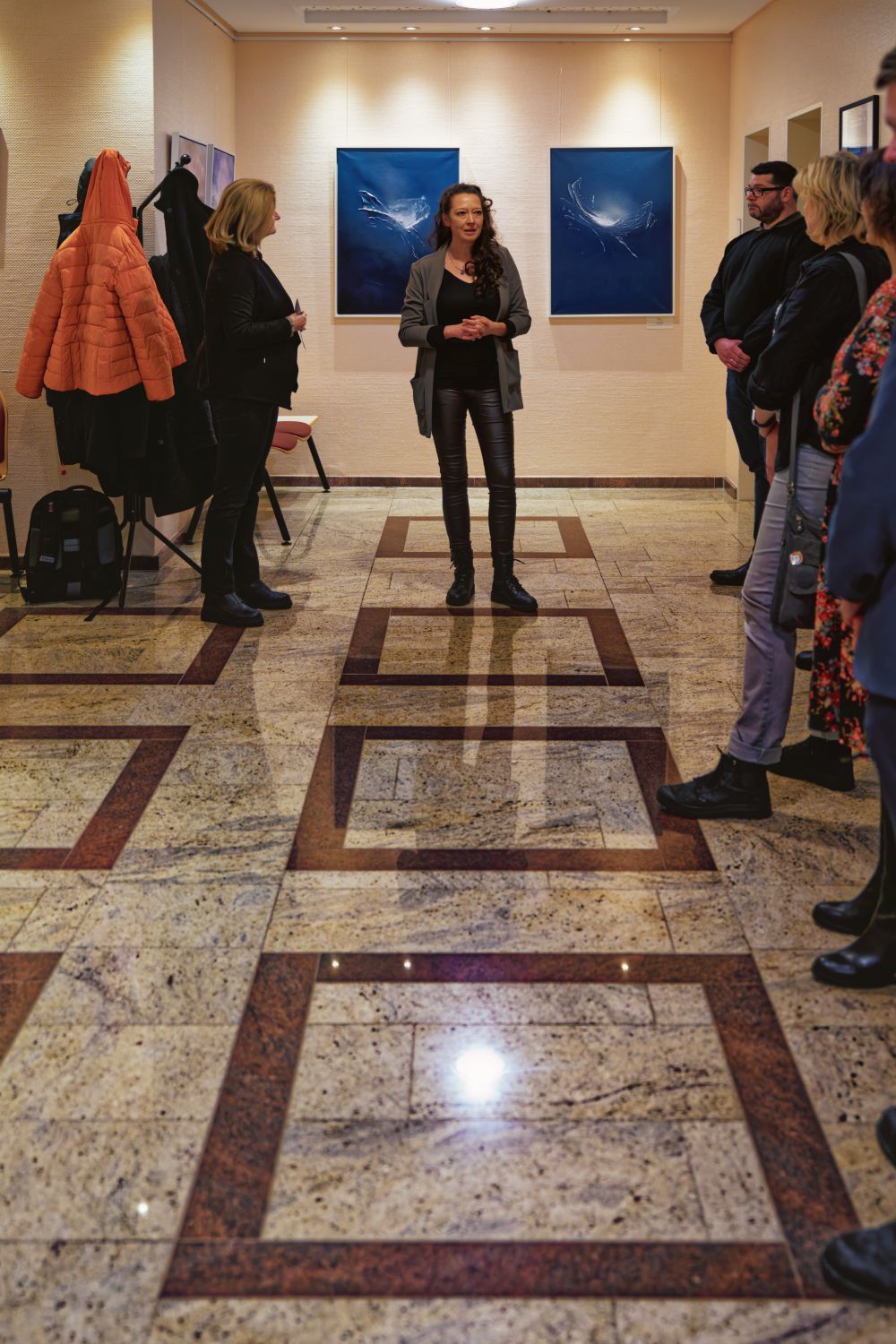 Die Vernissage beginnt im Erdgeschoss, im Foyer der Röntgenabteilung der Klinik. Eine außergewöhnliche Lokalität, praktisch steht hier Kunst, oder besser hängt, unmittelbar neben den notwendigen Einrichtungsgegenständen eines Krankenhaues. Ein besonderes Spannungsverhältnis in Betrachtung von nicht alltäglichen Werken.