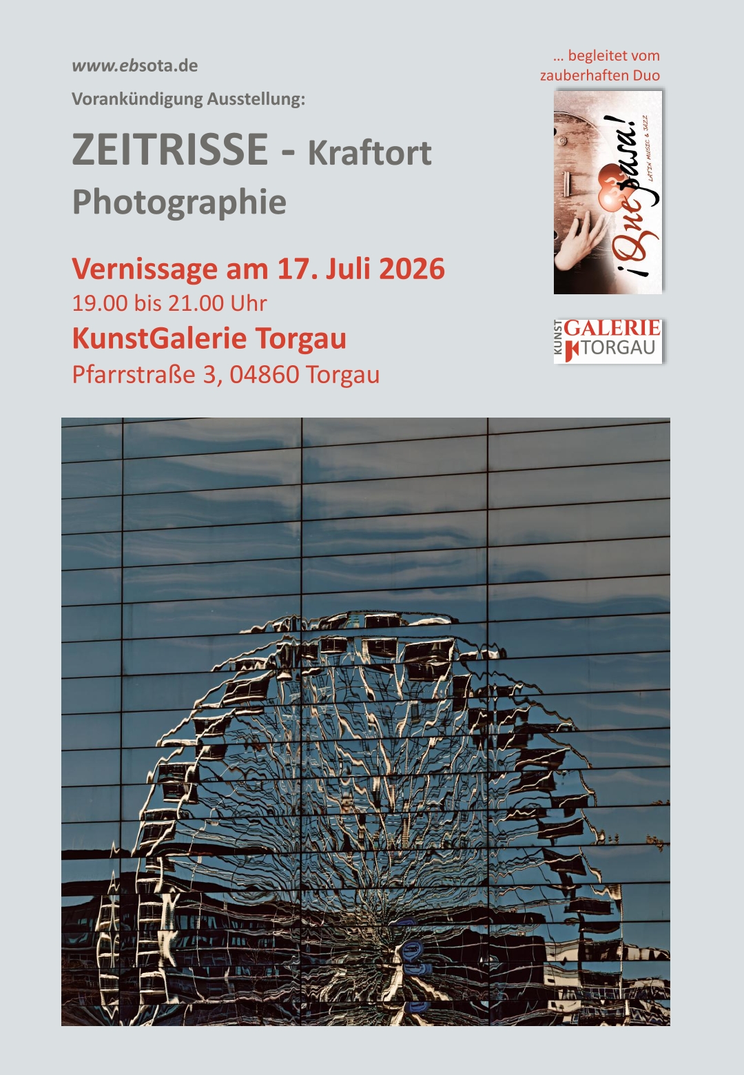 - Vernissage ist am Freitag, 17. Juli 2026, 19.00 Uhr in der KunstGalerie Torgau, Pfarrstraße 3, 04860 Torgau